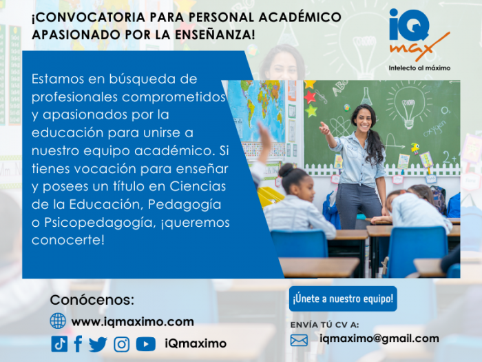 ESTAMOS EN BESQUEDA De profesionales comprometidas y apasionadas por la educación, para unirse a nuestro equipo académico. Si tienes vocación para enseñar y posees un titulo en Ciencias de la Educación, pedagogía o a fines. Envíanos tu hoja de vida a iqmaximo@gmail.com