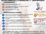 SE REQUIERE COMMUNITY MANAGER, con disponibilidad inmediata. Experiencia mínima de 2 años: licenciatura en comunicación, diseño gráfico o ramas afines, edad de 25 años a 35 años. Debe tener amplio conocimiento en plataformas tecnológicas tales como Facebook, Instagram, Google, etc. Debe generar contenido creativos por redes sociales, excelente redacción ortografía y carisma. Manejo de métricas e indicadores en redes sociales. REFERENCIAS 71790427, sgfyconstrucciones@gmail.com