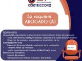 SE REQUIERE ABOGADO, con disponibilidad inmediata. Experiencia mínima de 2 años. Edad de 25 años a 35 años. Debe tener amplio conocimiento en trámites administrativos, visaciones en el sector de la construcción, buena redacción de documentos REFERENCIAS 71790427. sgfyconstrucciones@gmail.com