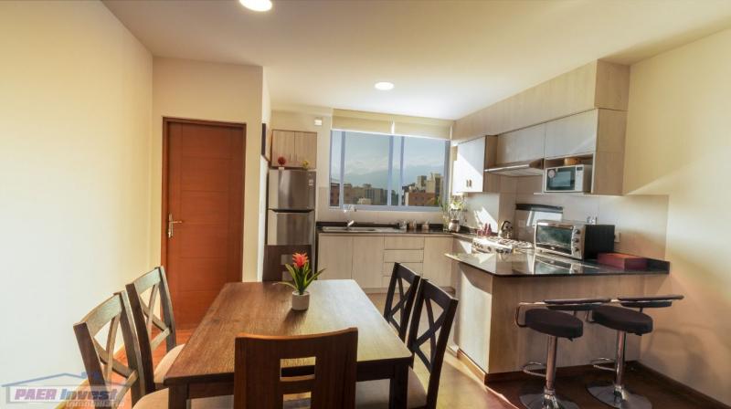 Vendo bonito departamento acogedor y con bastante sol de 3 dormitorios con amplios roperos y ventanales una suite con baño bastante iluminado con mesón de granito cajonería baja espejos grifería importados, sala, área de lavandería con muebles, cocina americana con cajonería baja y alta mesones compactos, Calefón a gas, extractor de cocina con salida externa, grifería de calidad, cajonería alta de cocina luminarias con perfiles y lámparas colgantes, q hacen al ambiente sea acogedor y con bastante claridad natural, piso flotante de alto tráfico, el departamento cuenta con cortinas, roler y persianas. El departamento tiene parqueo y está ubicado en el 5to piso el edificio tiene 7 pisos tiene 2 ascensores, salón de eventos gimnasio el edificio se encuentra ubicado frente al templo verbo divino calle batallón Colorados entre calle cornejo y Gabriel René Moreno, paralela a la Av. Juan de la Rosa No 2225 tel. 4513685 cel. 70747695